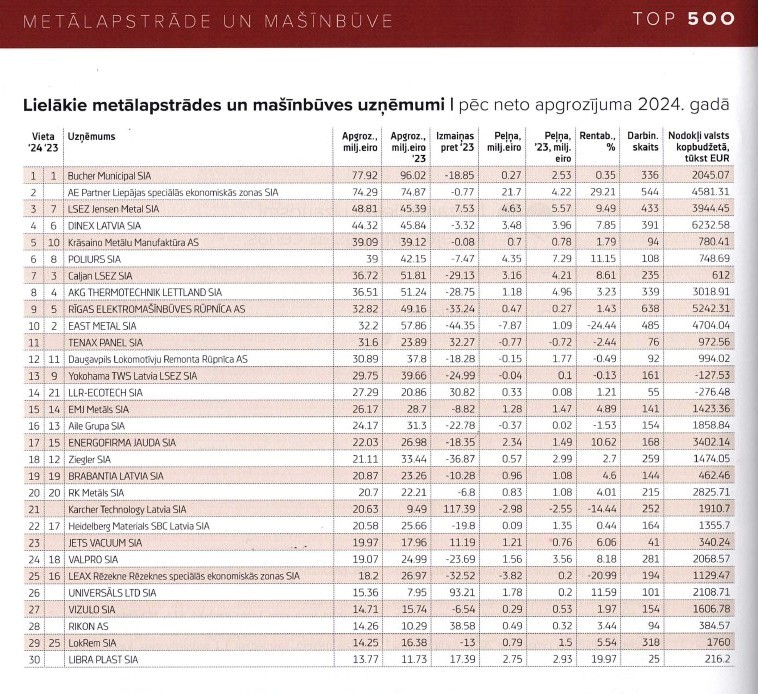 Lai arī oficiālie (precizētie un koriģētie) statistikas dati par 2024. gadu vēl nav pieejami, taču balstoties uz operatīvajiem datiem un Metālapstrādes un mašīnbūves rūpniecības asociācijas ekspertu vērtējumu jāsecina, ka nozare kopumā tika piedzīvots neto apgrozījuma kritums par aptuveni 6%. To savā ziņā arī atspoguļo metālapstrādes un mašīnbūves lielāko uzņēmumu Top 30. Turklāt ir bijuši neto apgrozījuma kritums par dažiem procentiem un arī 20-30%, kas ir ļoti liels. Kopumā 2024.gads nozarei pēc rādītājiem bija sliktākais ilgākā laika periodā. Rezultātā vairākiem nozares uzņēmumiem tika ierosināti maksātnespējas vai tiesiskās aizsardzības procesi. Lielākie no tiem – Skonto Plan un East Metal. Rezultātā Skonto Plan savu darbību beidza. Savukārt East Metal nomainījās īpašnieki no ārvalstu uz vietējā kapitāla īpašniekiem un darbība tiek turpināta, aktīvi strādājot pie esošo klientu bāzes stiprināšanas un jaunu klientu piesaistes.